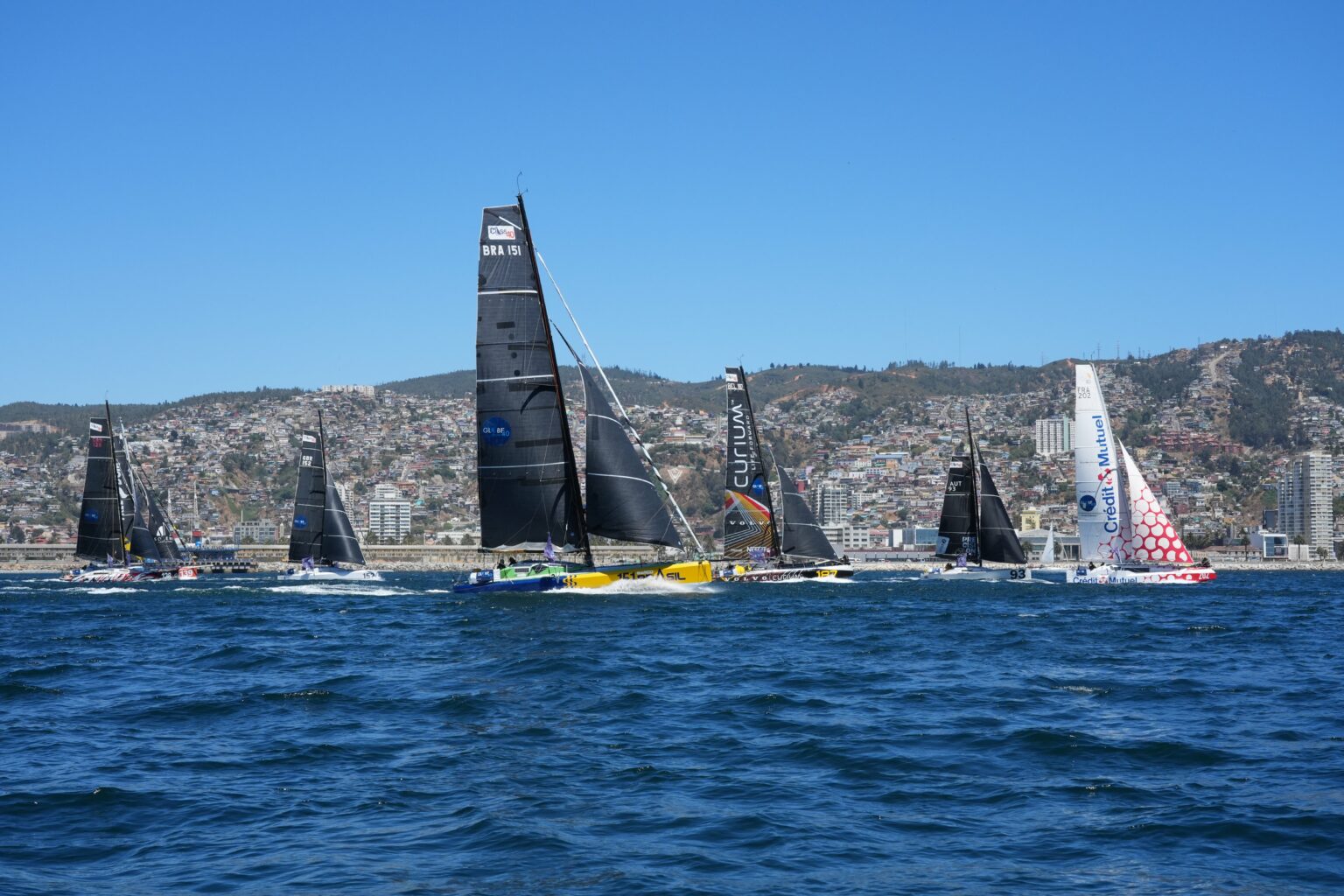 Ce jour à 14.20 locales (17.20 UTC) les concurrents de la 2ème édition de la GLOBE40 se sont élancés de la Baie de Valparaiso par 25 noeuds et grand soleil pour la 5ème étape de l’épreuve. Long de 4860 milles en route directe, ce parcours est d’abord marqué par le passage du mythique Cap Horn, 3ème grand cap de l’aventure, et par une remontée de 3000 milles vers Recife au Brésil dans une zone complexe en termes météorologiques. L’étape coefficient 2 verra sans nul doute un nouvel affrontement entre les deux leaders déclarés ex-aequo à l’arrivée au Chili ; BELGIUM OCEAN RACING – CURIUM est en tête au classement général avec 2 points d’avance ; 2 points qu’il faudra gagner pour CREDIT MUTUEL pour espérer égaliser avant une dernière étape coefficient 2 vers Lorient, une étape qui pourrait s’annoncer comme le juge de paix de la course. Chez les Class40 classiques le retour de FREE DOM, après l’héroïque traversée en solitaire du Pacifique, va relancer la compétition pour le classement « pointus », tandis que les autres concurrents chercheront tous des points à gagner avant les dernières échéances. Sous réserve de tout nouvel incident le retour des allemands de NEXT GENERATION à Recife devrait permettre à la flotte de se retrouver au complet dans le dernier effort vers Lorient.